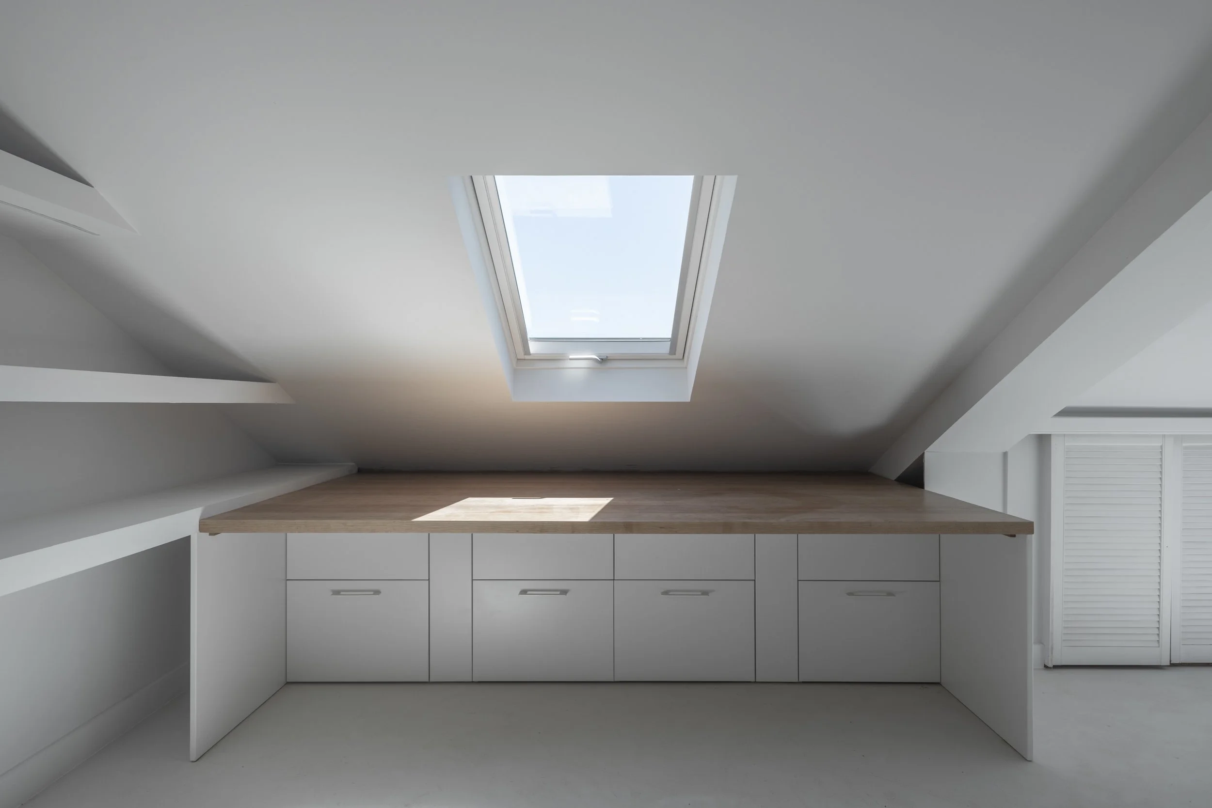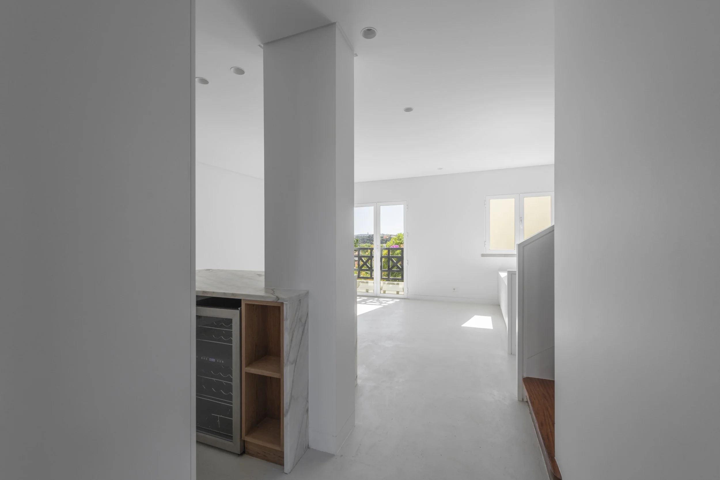 À cota da entrada, a cozinha e espaço de refeições, distribuem para o piso inferior, piso superior e sótão. No piso abaixo, criou-se uma grande zona de estar semi-enterrada, que articula com o pátio exterior - funcional e privado. No primeiro piso instalaram-se os quartos e o sótão foi reservado a espaço de trabalho/escritório.