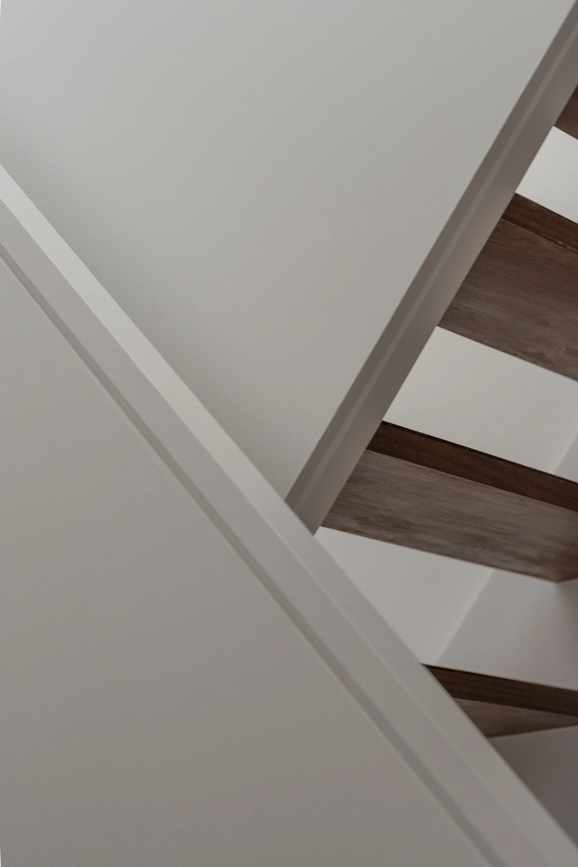 As escadas, elementos importantes, vão variando na sua matéria, de acordo com os pisos que ligam, tornando-se mais leves e imateriais à medida que se vai subindo.